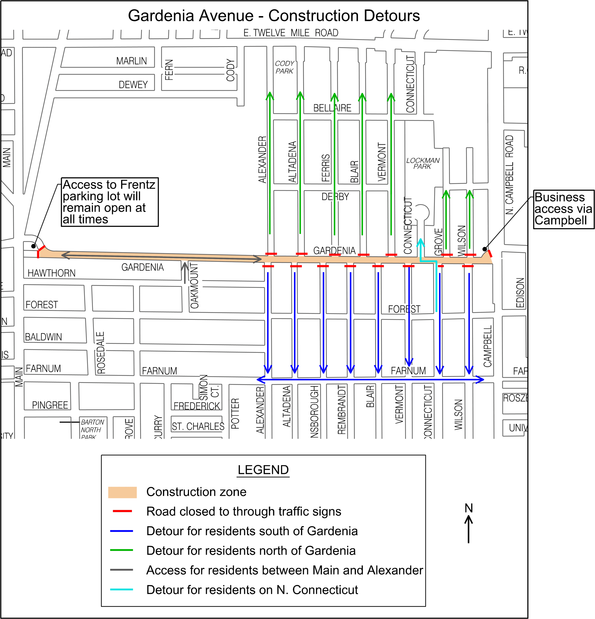 The city will be resurfacing Gardenia Avenue from just east of Main Street (east of Frentz & Sons Hardware) to Campbell Road. Construction is scheduled to be completed by mid-October 2018. The city has closed Gardenia Avenue to thru-traffic and is prohibiting side street traffic from entering Gardenia between Main Street and Campbell Road as shown on the map below.